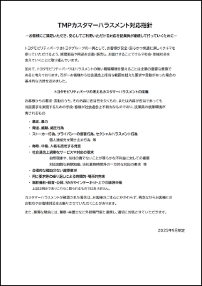 加えて、トヨタモビリティパーツはハラスメントの無い職場環境を整えることは企業の重要な責務であると考えております。万が一お客様から社会通念上相当な範囲を超えた要求や言動があった場合の基本的な方針を定めました。